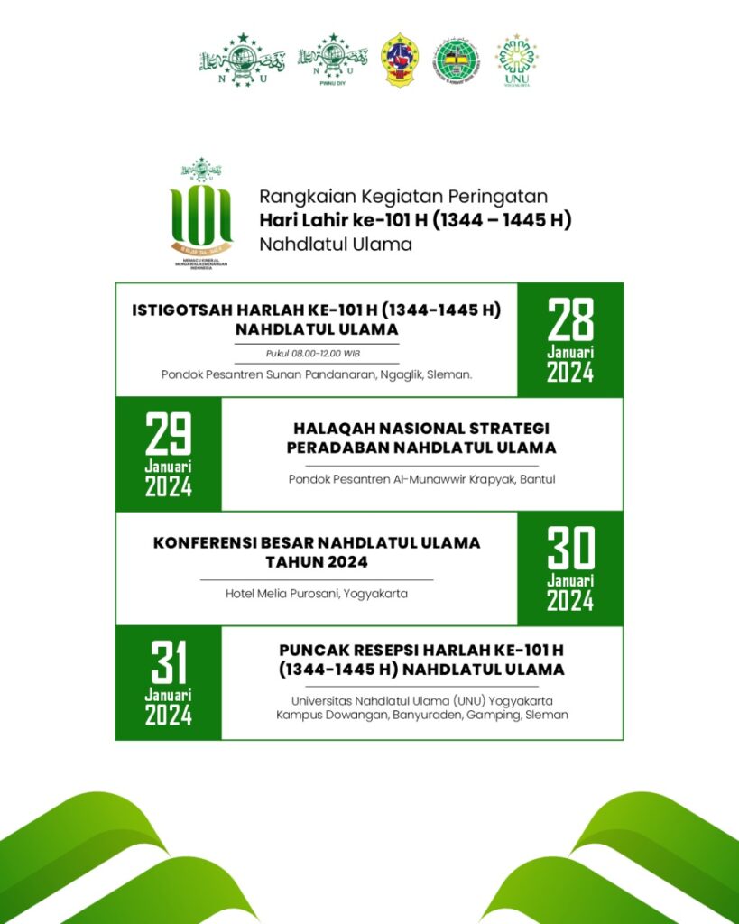 Peringatan Hari Lahir (Harlah) ke-101 tahun Nahdlatur Ulama (NU) berlangsung 28 Januari 2024. Berikut rangkaian acara puncak resepsi Harlah ke-101 NU yang akan dilaksanakan pada 31 Januari 2024. Gunakan juga Twibbon Harlah NU ke-101 untuk menyemarakkan peringatan hari ulang tahun (HUT) organisasi keagamaan terbesar di Indonesia ini.
